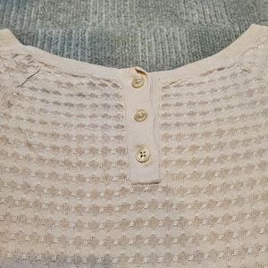 Cuffed 1/2 sleeve. Chunky rib knit. Scoop neck. Slightly sheer. Three-button closure at back of neck. Can be worn slightly higher on waist for slouchy effect.