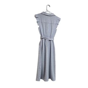 This charming button-down floral midi dress features delicate ruffle sleeves and a classic collar, perfect for a casual day out or a relaxed work setting. With front pockets for added convenience and a flattering tie waist, this dress combines style with practicality. Enjoy its lightweight fabric and versatile design, ideal for warm weather and easy layering.
