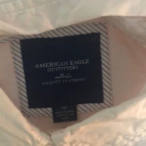 Pink long-sleeve, button-down shirt, Size 16 from American Eagle (bought a long time ago, so I think this is an XL), in EUC, comes from a smoke-free home. Thanks.