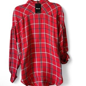 Button Down Plaid Top. Features roll tab sleeves. Pics on mannequin and with measuring tape are size S.