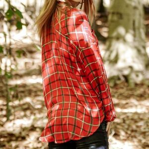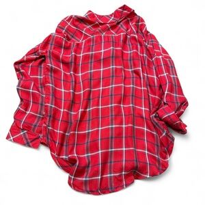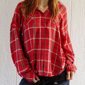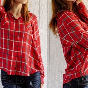 red plaid, button front, roll tab sleeves, rayon top, casual western, flannel style, relaxed fit, checked pattern, outdoor wear