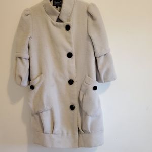 Light gray coat with three-quarter sleeves. Features exposed black buttons down the front and on the pockets. Small collared neckline. Cut in a loose silhouette. Size XS fits loose, can also fit a small.