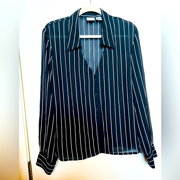 Button front, long sleeved blouse. Black and white polyester crêpe fabric. Vintage, purchased new about 10 years ago and never worn. Therefore, it is in like-new condition. Runs small. Label says size 18. Flat measurement from armpit to armpit is 21 inches. The blouse’s size in current day sizing is probably no larger than 16 rather than the size 18 on the label.
