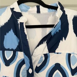 Chic button-front mini dress in a bold blue and white geometric print. Lightweight fabric with a relaxed, tiered silhouette. Versatile style for daytime events and casual outings. Features long sleeves and a flattering V-neckline. Includes light blue and navy blue color accents.