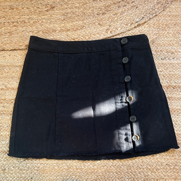 Simple and versatile black mini skirt with a structured feel and subtle A-line shape. Features a button-front detail and raw hem for a slightly edgy, casual finish. Easy to pair with anything from basics to elevated pieces.