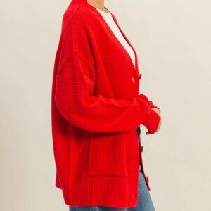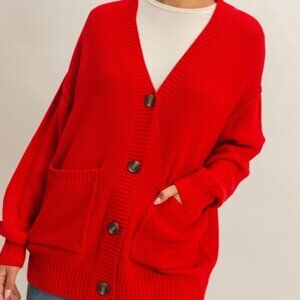 Designed Into A Relaxed Silhouette With A V-Neck, Drop Shoulders And Long Sleeves. It Is Fastened By A Button Closure Down The Center And Accented With Front Patch Pockets.