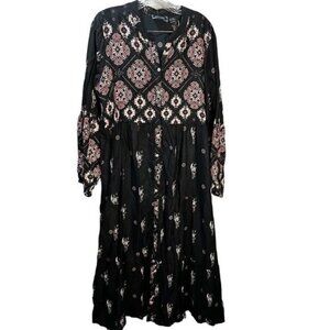 Elegant and comfortable, this button-front maxi dress features a vibrant scarf print, perfect for making a statement. The lightweight fabric ensures a breezy fit for any occasion.