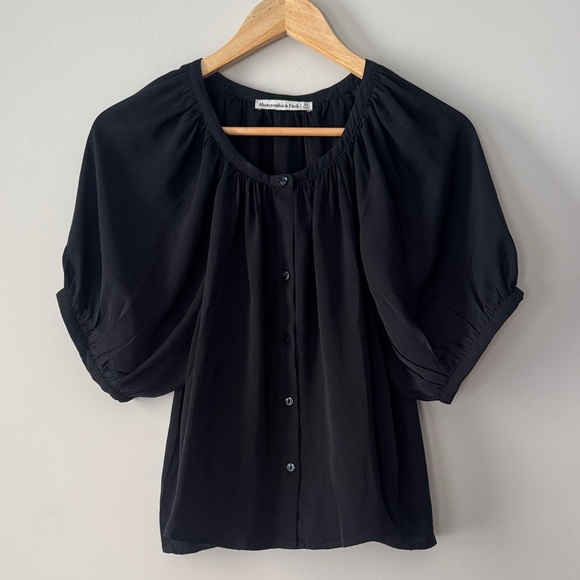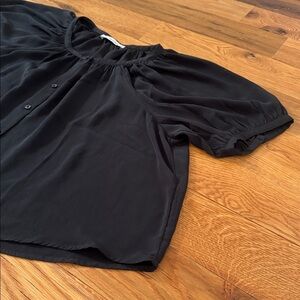 Field blouse, swing top, very beautiful round neckline with buttons all the way down the front. Gathered puff sleeves with beautiful grosgrain ribbon hems and button detailing. Feels like silk! Drapes beautifully