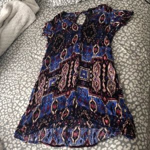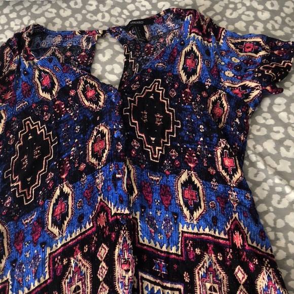 Patterned dress with buttons all down the front, tied at waist in back. I’d recommend to people with a shorter torso, I’m 5’5” for reference!