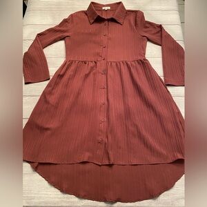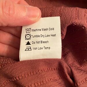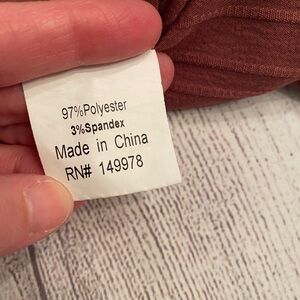 Very cute dress that is longer in the back than front. It has pockets! Polyester/spandex blend that is easy to care for. I think it would be great to travel with because it doesn’t wrinkle easily. Purchased at a local boutique but it doesn’t fit me properly unfortunately. Never worn, just tried on at home. Washed prior to listing. Now the color…I don’t know how to describe. It’s like a rust/wine/brown combination. It’s very pretty but if you specifically need a 100% accurate description, I can’t help you. Measurements in photos. Smoke free, cat 🐈⬛ 🐈 friendly home.