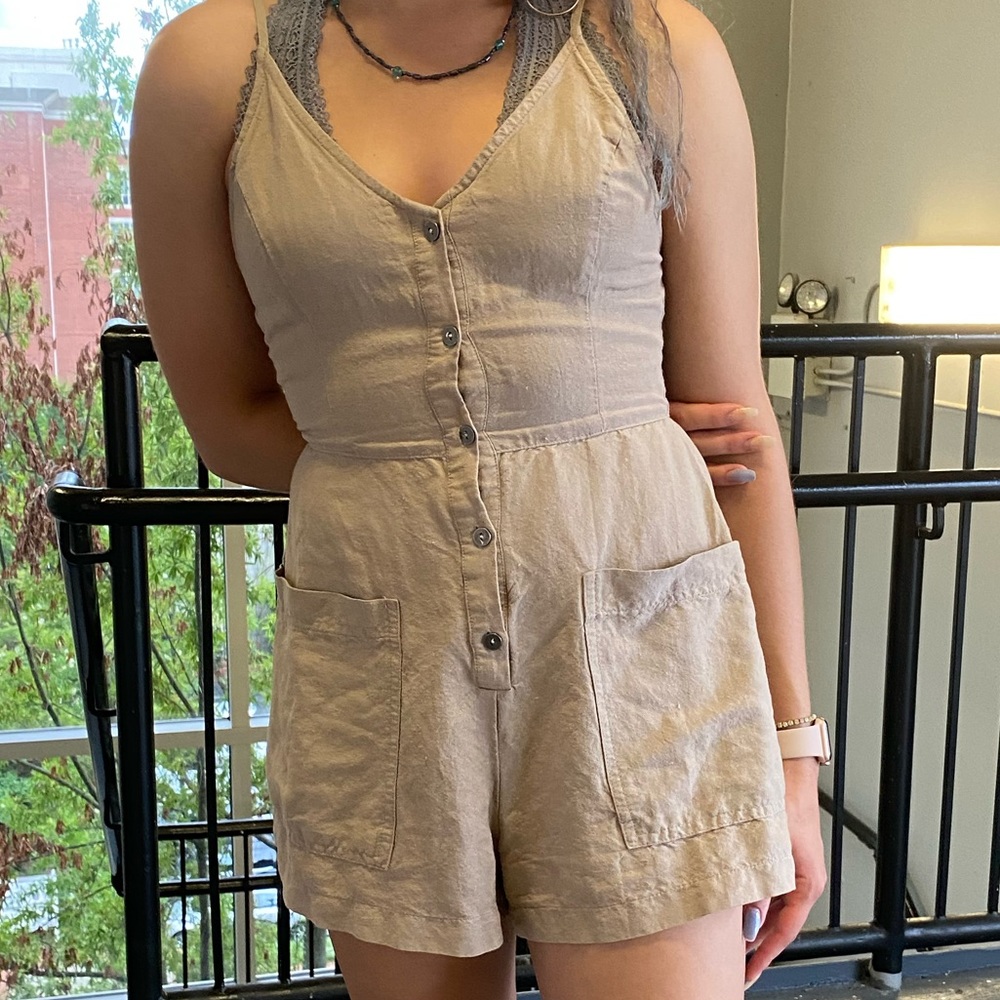Beige, khaki almost material Bronze buttons in front Adjustable straps Size S, tight on the waist