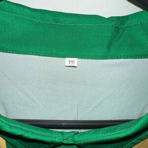 This is a short-sleeved, collared button-up shirt in size XXL. The shirt features vertical stripes in green, white, and yellow, with a shamrock graphic on the left chest. It has a single chest pocket with a green trim. The material appears to be a lightweight, possibly synthetic fabric. The shirt is green on the back and sleeves. No visible signs of wear or damage are apparent.