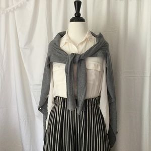 Details: Lightweight shirt blouse in cream white. Collared neckline with 8-button placket. Adjustable long sleeves with button closure, can be cuffed with button to 3/4 length. 2 buttoned chest pockets. Semi-sheer. Perfect for Spring or Summer.