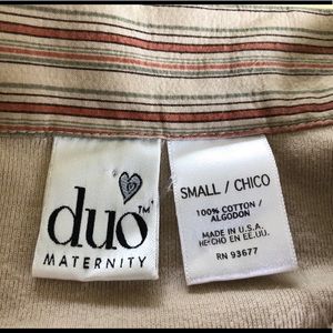 duo Maternity Top Tan with rust & khaki striped collar Buttons up from middle Size Small 100% cotton