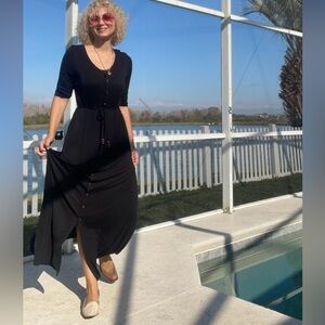 This elegant black dress features a classic button-down design, perfect for any occasion. Its timeless style and comfortable fit make it a wardrobe essential.