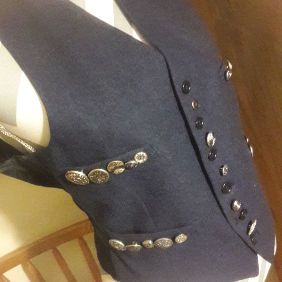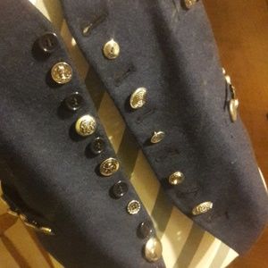 Navy blue vest and silver buttons. feels and looks like wool. Adjustable strap in the back to cinch.