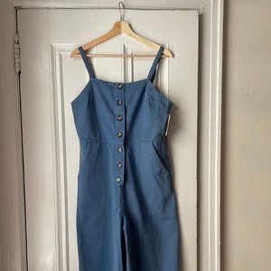 new buttoned denim jumpsuit with pockets, adjustable straps, and frayed straight legs. Never worn, tags still on. Comment for measurements