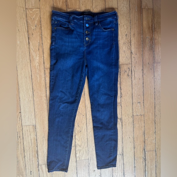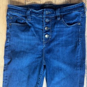 Liverpool brand. Button fly, high rise, ankle length. Dark wash in very good used condition. Size 30 with 25.5” inseam.