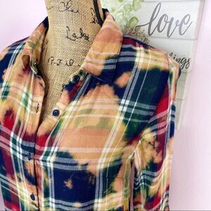 Peach orange multi color, Plaid, Bleach dyed, Long sleeve, Button front, Button cuffs, Tab & button sleeves for rolling, Light weight rayon flannel, High low hem line
