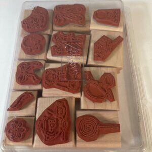 This Stampin' Up! "Buttons Bows and Twinkletoes" rubber stamp set features 12 high-quality mounted stamps from the 2003 collection. Each stamp showcases detailed designs for crafting, scrapbooking, and card-making projects. Mounted on wooden blocks, these stamps provide durability and precision for repeated use in custom handcrafted designs.
