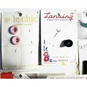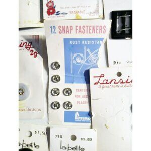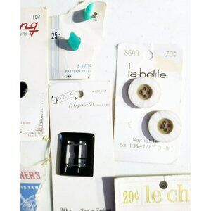 This curated collection includes vintage buttons and fasteners from brands like Le Chic, Lansing, and La Petite. Ideal for sewing enthusiasts or collectors, these pieces add a unique retro touch to garments or projects. The assortment has a variety of sizes, colors, and styles, making it versatile for numerous creative applications.