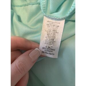 Elevate your style with this stunning Buttons Label Tiffany Blue Teal Silver V Neck Short Sleeve Mini Dress in size Medium. The dress features a beautiful combination of silver and multicolor accents that make it perfect for any occasion. The V-neckline and short sleeves add a touch of elegance, while the mini length and metal theme give it a unique edge.