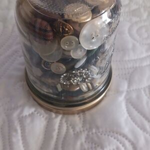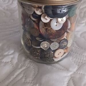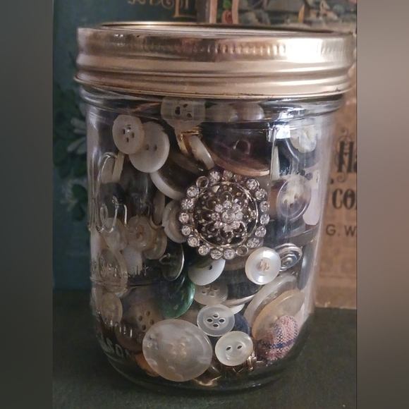 Pint size Kerr jar full of buttons vintage mix of random buttons some decorative some plain some vintage some newer all great for crafting! Pics show approx. size and condition.