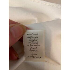This elegant sleeveless ivory shift dress features a floral lace overlay and scalloped hem, suitable for formal or semi-formal settings.