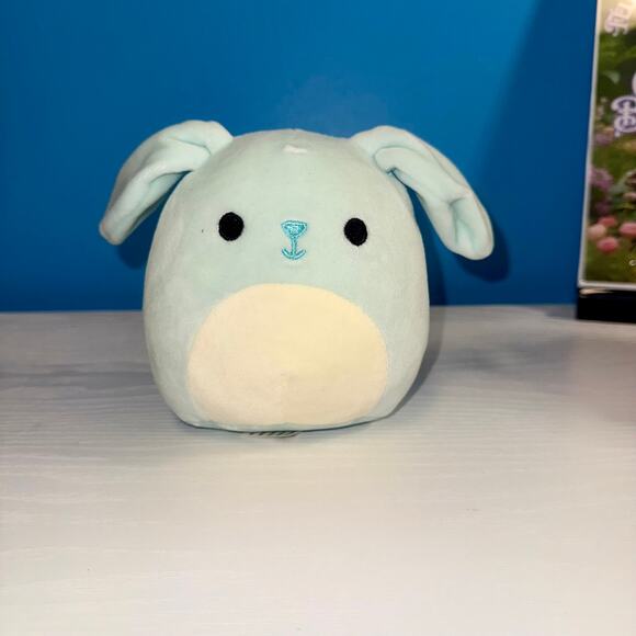 Authentic Squishmallows Buttons the Bunny plush by Kellytoy. This pastel bunny features a light mint blue body, cream belly, floppy ears, and embroidered nose detail in classic Squishmallow style. Approx. 5 inches tall (see measurements). Tag ID Q042, batch 2705, production date 10/2020, made in Jining, China. Excellent used condition with no stains, holes, or odors. Perfect for collectors, baskets, or small-space displays.
