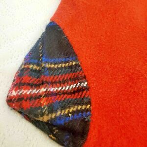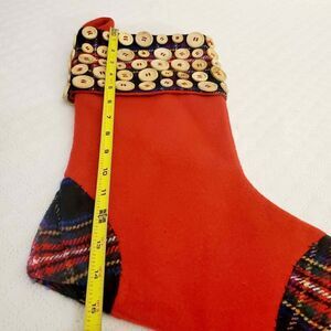 Red Christmas stocking with plaid and buttons details. Pre-owned in good condition. Please refer to pictures, condition verification, and measurements.