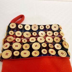 Red Christmas stocking with plaid and buttons details. Pre-owned in good condition. Please refer to pictures, condition verification, and measurements.