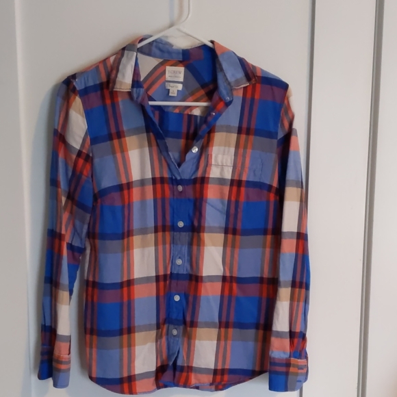 Blue, orange, and beige button up from J Crew. Looks great tucked or worn open with a cute t-shirt underneath.