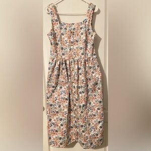 Button-up Dress with front patch Pockets. Beautiful floral all-over print in natural tones of pinks, tans, and blues on a white background. Flattering gathered waist, would be cute fitted or loose, depending on your measurements (see pictures and details below).