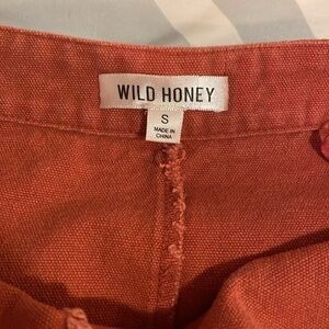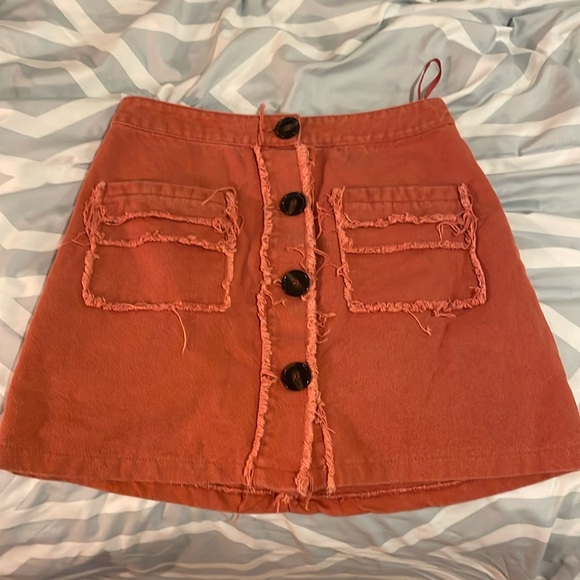 Red-orange button-up skirt with front pockets and distressed lining. Bought at an expensive boutique in Monterey, CA several years back. Great condition, no visible signs of wear or tear. 100% cotton.