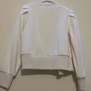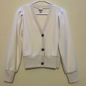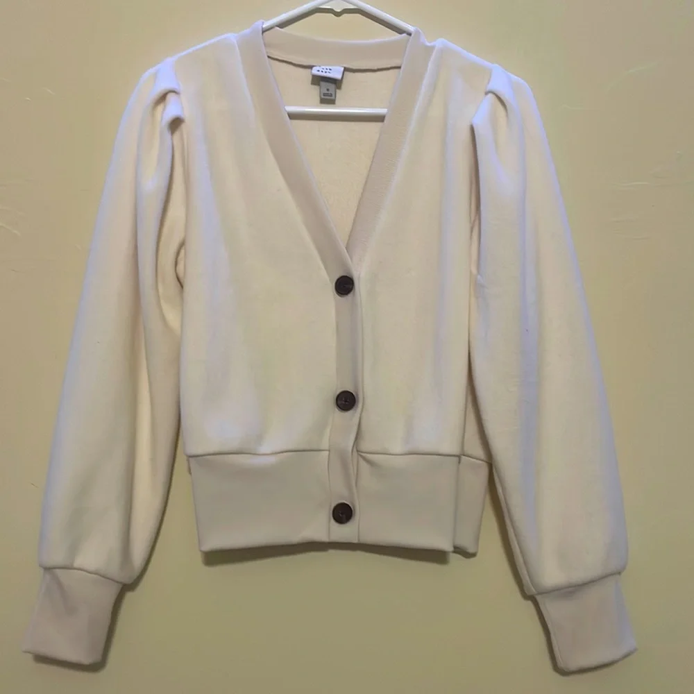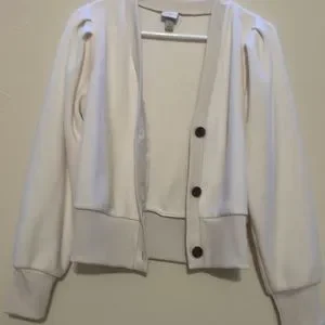 Warm button-up sweater for spring and fall weather. Has never been worn but cleaned anyway. Color is all cream with brown buttons. Texture is very soft to the touch and the sleeve cups are silky.