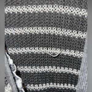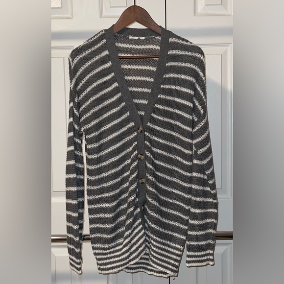 Gray & white striped button down sweater/cardigan. The tags have been cut out so I’m unsure of the size or brand. I would guess it’s a L/XL. I am a S/M usually, & I cuffed the sleeves and worn it as an oversized outer layer. 🙂 There is a pull to the inside, but unnoticeable when worn.