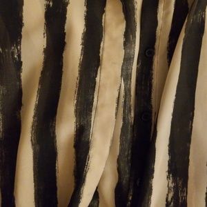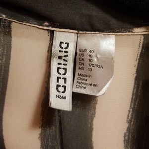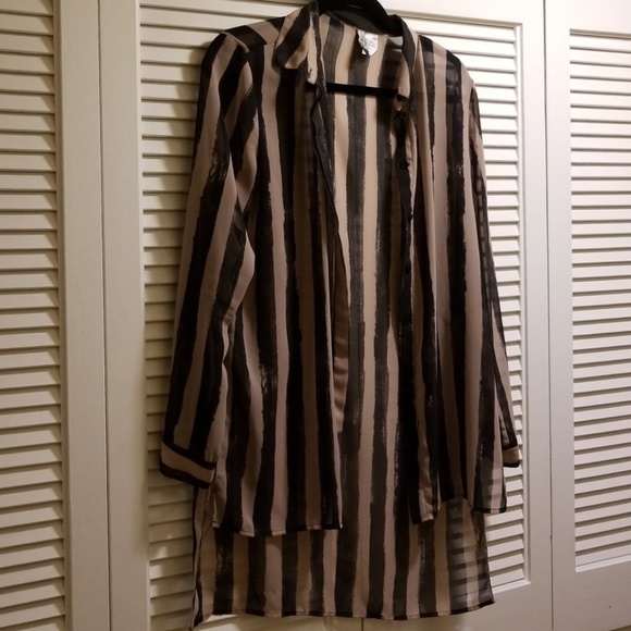 Brand Divided, size 10 button-up top. It is long in nature so can go with leggings. Slimming design.