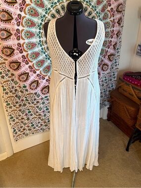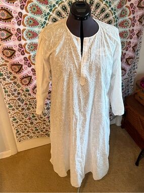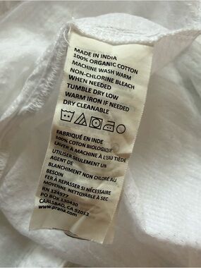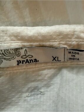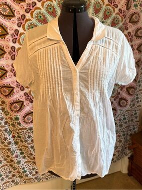 White, organic cotton, button-up blouse. Very comfortable. Can be dressed up or down.