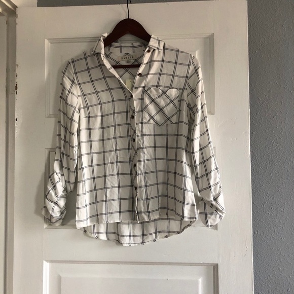 New with tags! Button-up top by Harper from Francesca’s. White with black plaid pattern and SUPER soft. Perfect staple item all winter long. Size XXS