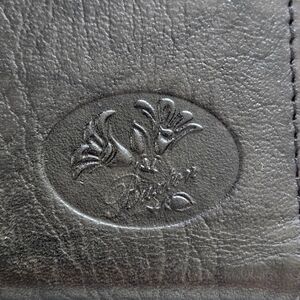 Sleek black leather wallet with embossed logo. Features a secure snap closure.\