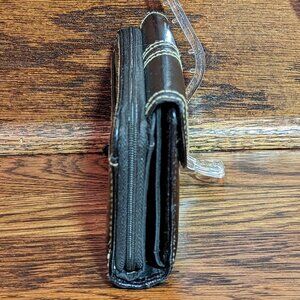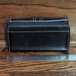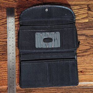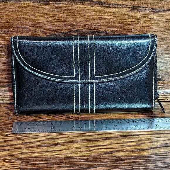 This classic black leather wallet features contrasting white stitching, a checkbook and bill holder, multiple pockets (zipper and slip) and 7 credit card slots. Wallet is stamped with Buxton's Genuine Leather Exterior certification and shows no wear or damage.