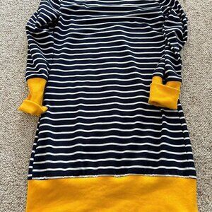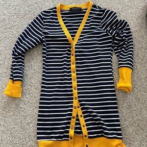 Embrace nautical vibes with this stylish long cardigan! Featuring blue and white stripes with charming yellow accents, this piece is perfect for layering. The snap closure adds a functional yet chic touch. Lightweight and versatile, it's great for cool evenings or seaside strolls.