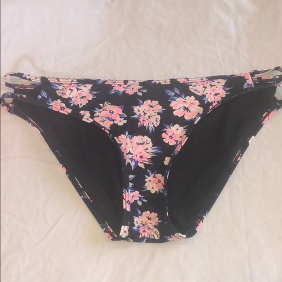 Xhilaration bikini bottoms, size M, EUC NO chlorine or bleach holes. No fraying , fading, tears, rips, or stains. Tropical blues, pinks, and white floral on black background.
