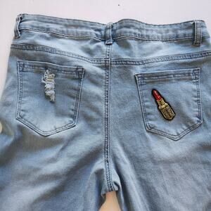 -Cute lipstick patch on back pocket, unfinished hems