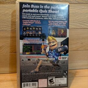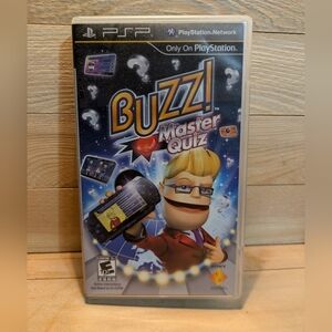 Experience the fun of Buzz! Master Quiz on your PSP. Enjoy engaging quizzes with friends. Features a sleek black design.