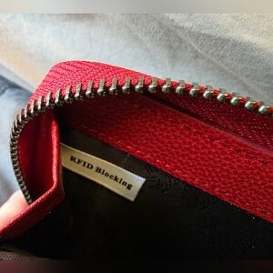 Bveyzi RFID blocking wallet Red Zips up and has short carrying strap Lots of spots for cards Measures approximately 4" x 8"