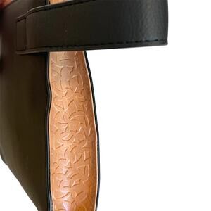 New Elegant Bvlgari for Emirates toiletry travel case in black faux leather with tan textured accents. Features gold-tone logo hardware, side handle, zip closure, and elastic interior pockets with branded lining. Stamped Bvlgari Parfums and Emirates inside. Empty and ready to travel with your favorite products!