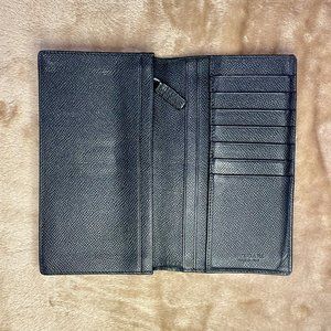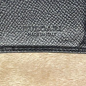 Leather bifold long wallet in saffiano leather. In good overall condition. Edging nice and smooth, zipper rail runs smooth. Has 7 card slots, 4 slip pockets, 2 compartments, and 1 zippered pocket. No tears or rips or weird smells. Zippered pocket is lined with nylon branded with Blvgari logos.
