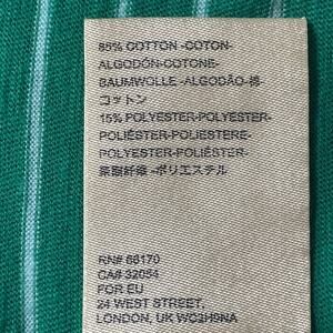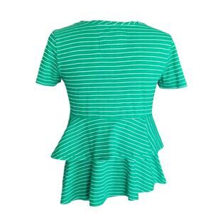 By Anthropogie Kelly Green White Stripe T-shirt Ruffled Back Sz SMALL Preppy. Fabric is 85% cotton, 15% polyester. Scoop neck. Short sleeves. Back has ruffle detail, creating a look almost like a peplum.