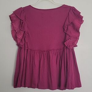 By Anthropolgie Caroline Raspberry Babydoll Blouse Ruffled Flounce sleev…